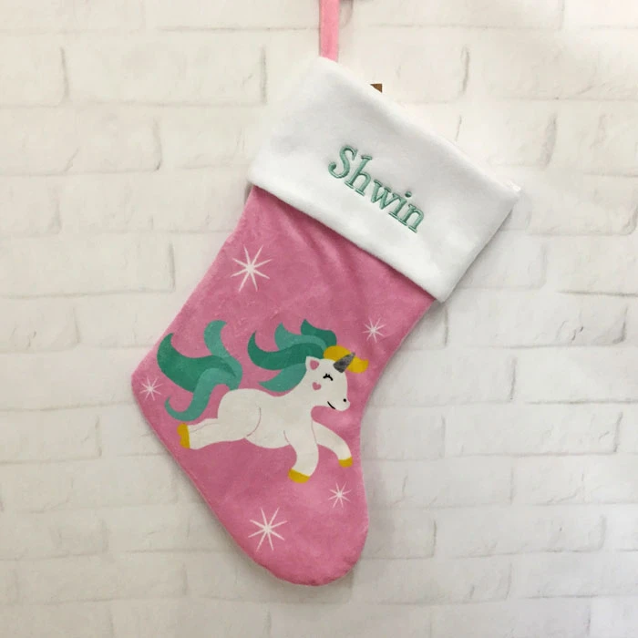 This top of the range, luxury personalised pink unicorn Christmas stocking is professionally embroidered with the little girl’s name in your choice of coloured thread. This fabric stocking features a cute prancing unicorn design. Please check your personalisation carefully before submitting your order.