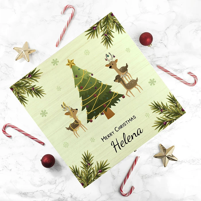 Your kids will be super-excited to find this bespoke reindeer-themed Christmas Eve box filled with treats and sweets on the 24th December! The lid is decorated with a cute traditional festive design complete with a small herd of reindeer gathered around a beautifully-dressed Christmas tree. The lid of the box comes professionally personalised with any name (the text ‘Merry Christmas’ is fixed) Please check your personalisation carefully before submitting your order.