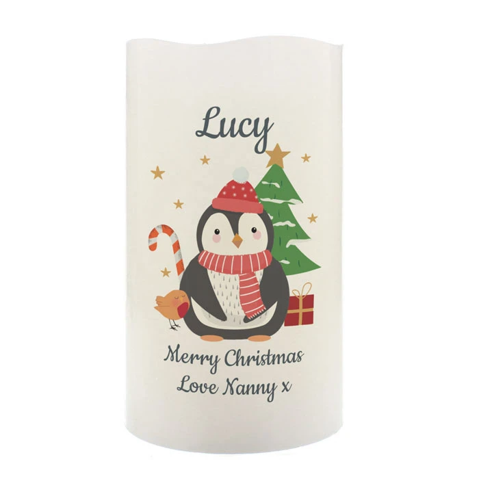 - Personalised baby’s 1st Christmas penguin LED candle.