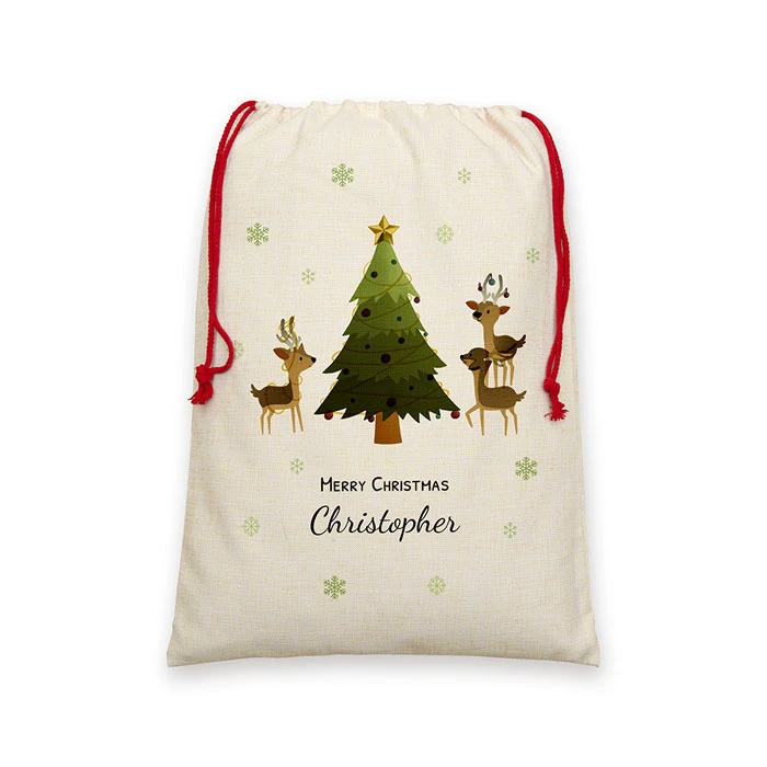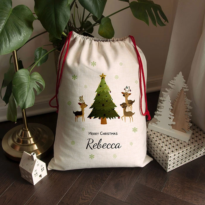 This personalised Christmas sack features a gorgeous Reindeer family design and comes professionally personalised with any name in a script font. The words ‘Merry Christmas’ come as standard text. Please check your personalisation carefully before submitting your order.