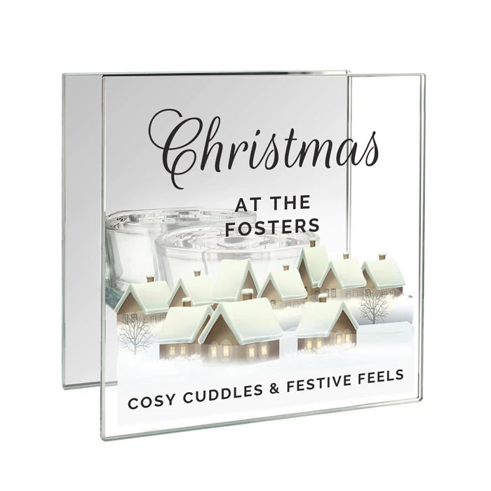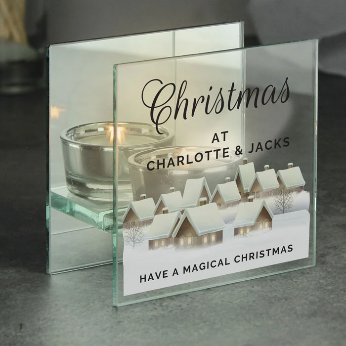 This beautiful personalised Christmas village glass tea light holder is a great addition to your festive decorations. This item can be personalised with up to two lines of text. Please check your personalisation carefully before submitting your order.