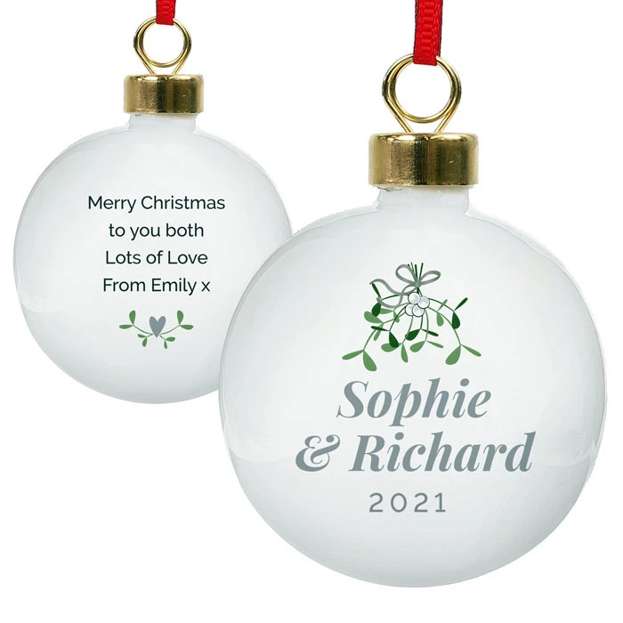 - Personalised couple’s mistletoe Christmas tree bauble.