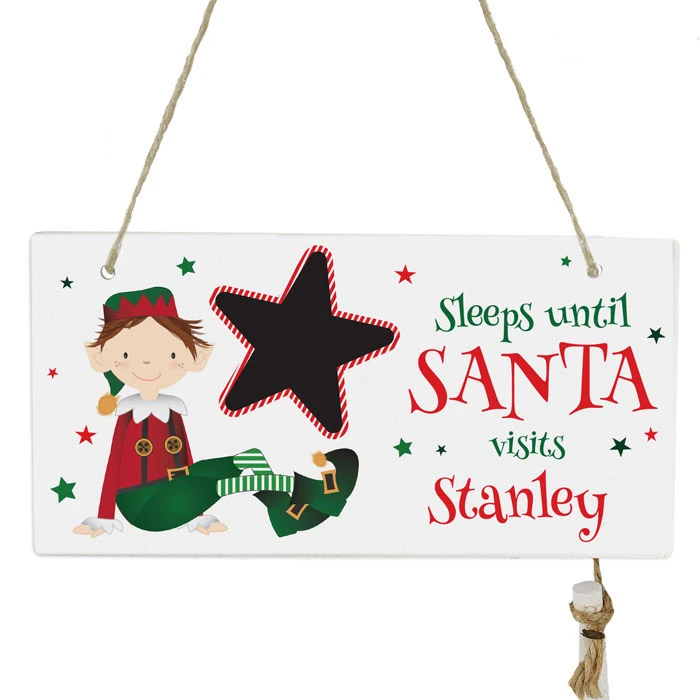 This personalised wooden Christmas countdown hanging sign features a cheeky Elf design. This makes a great way for the kids to countdown to Christmas. Complete with chalk so you can fill in the number of days. Let the countdown begin!