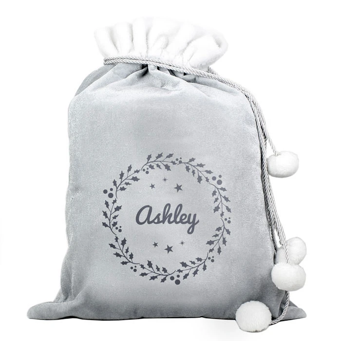 - Personalised Silver Holly Wreath Pom-pom Santa Sack.