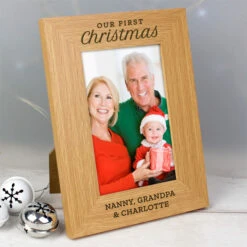 This festive personalised first Christmas photograph frame features engraving of your choice over 2 lines and will make a beautiful gift and memory-keepsake of a baby’s first Christmas.