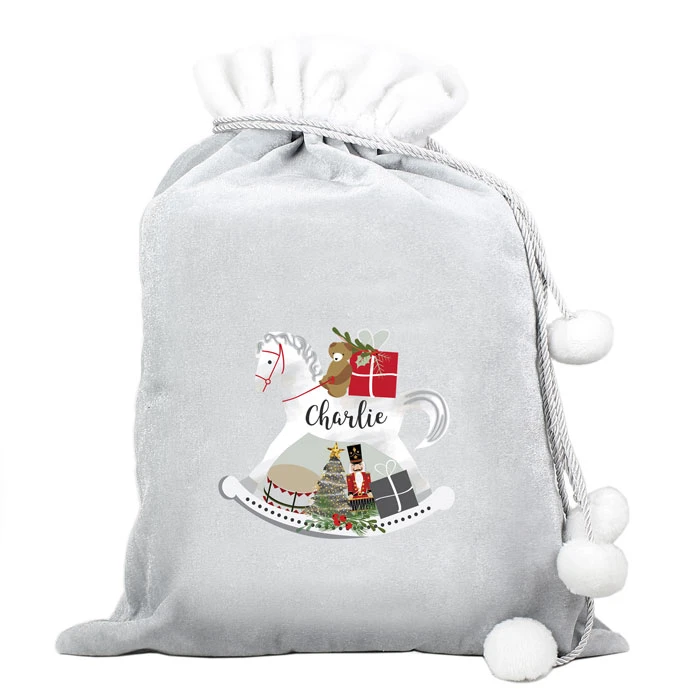 - Personalised silver rocking horse pompom Christmas sack.
